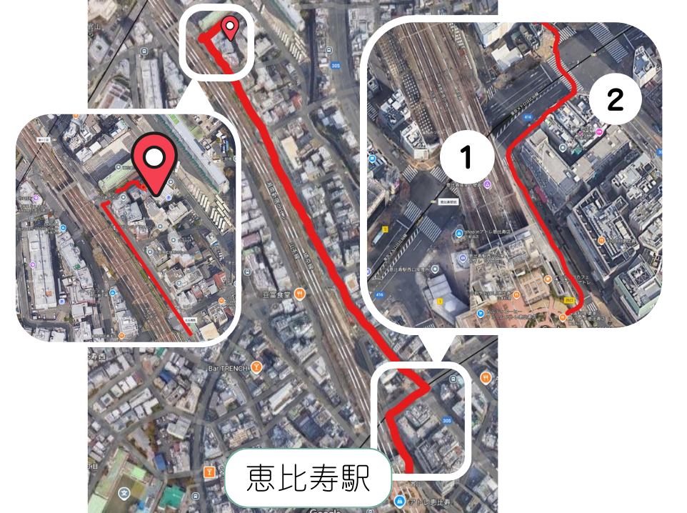 恵比寿1丁目の大きな交差点の横断歩道(詳細図の②)を渡ります。